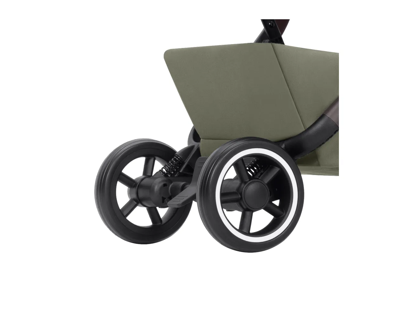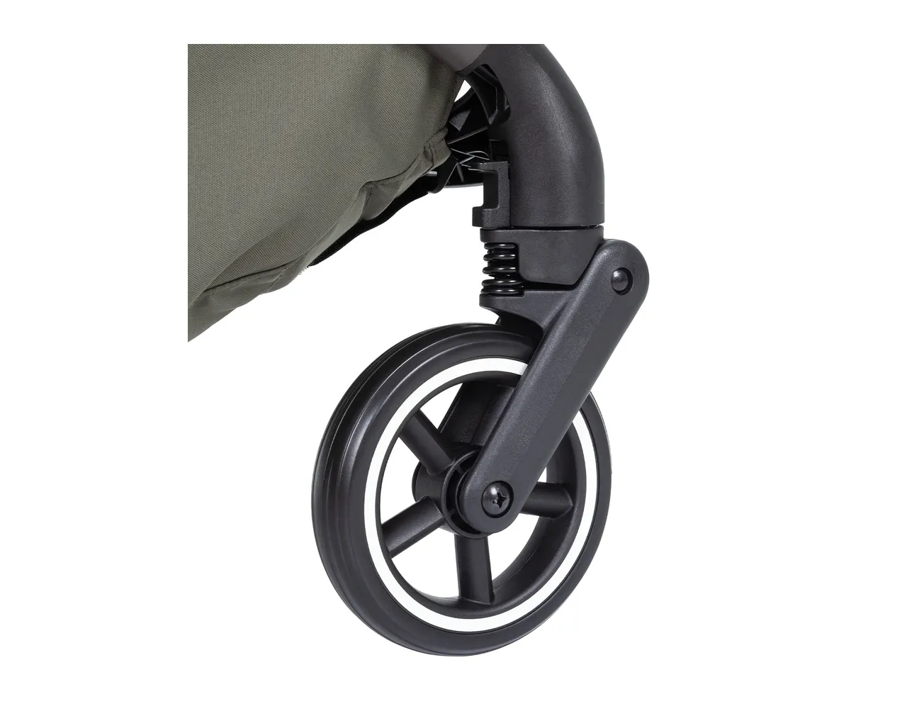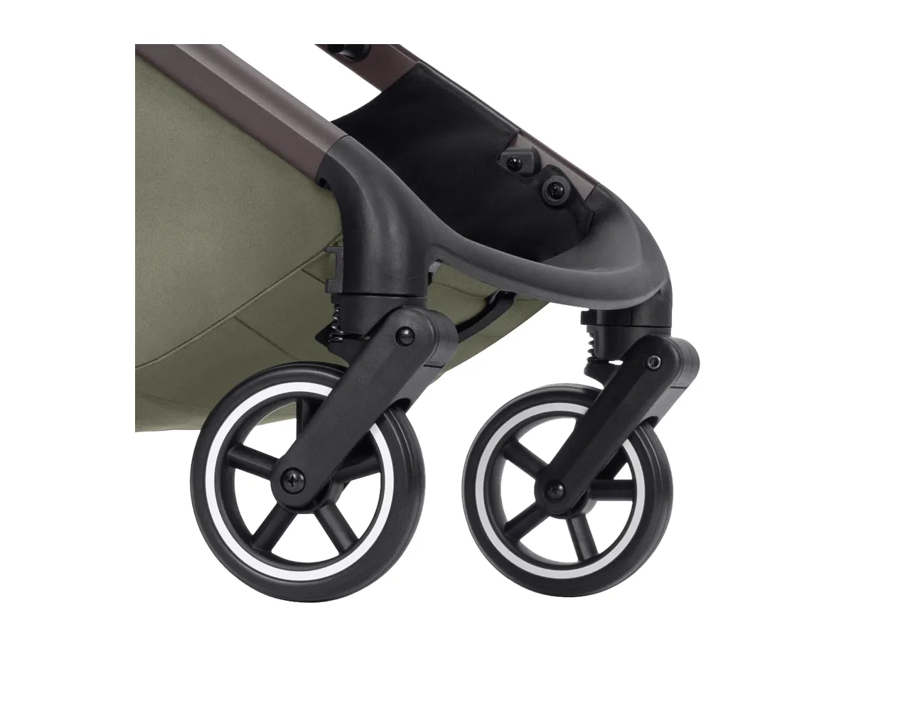 Mimo małych rozmiarów, koła są wykonane z wytrzymałej gumy odpornej na przebicia. Posiadają pełną amortyzację sprężynową, co sprawia, że wózek prowadzi się niezwykle lekko na gładkich nawierzchniach lotnisk, galerii handlowych i miejskich chodników.