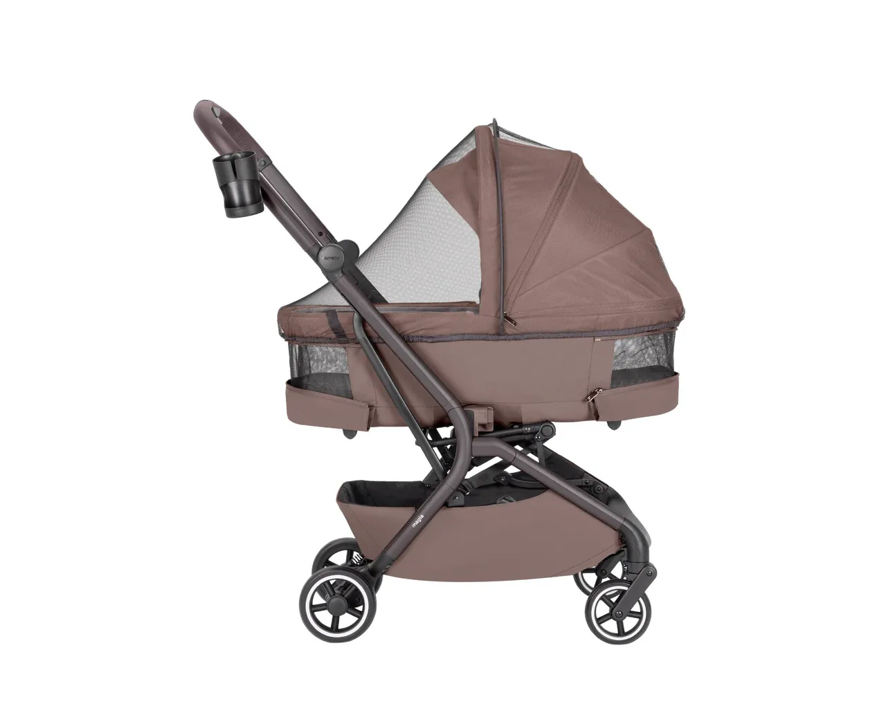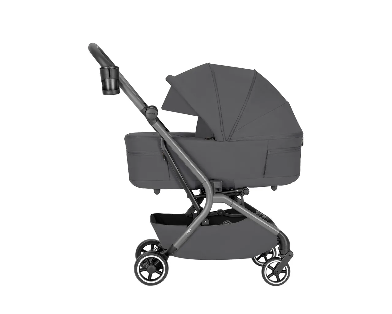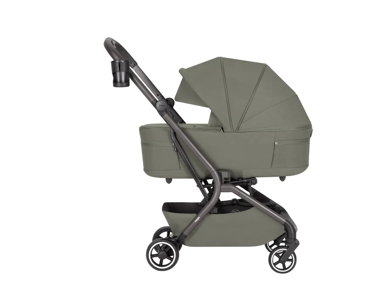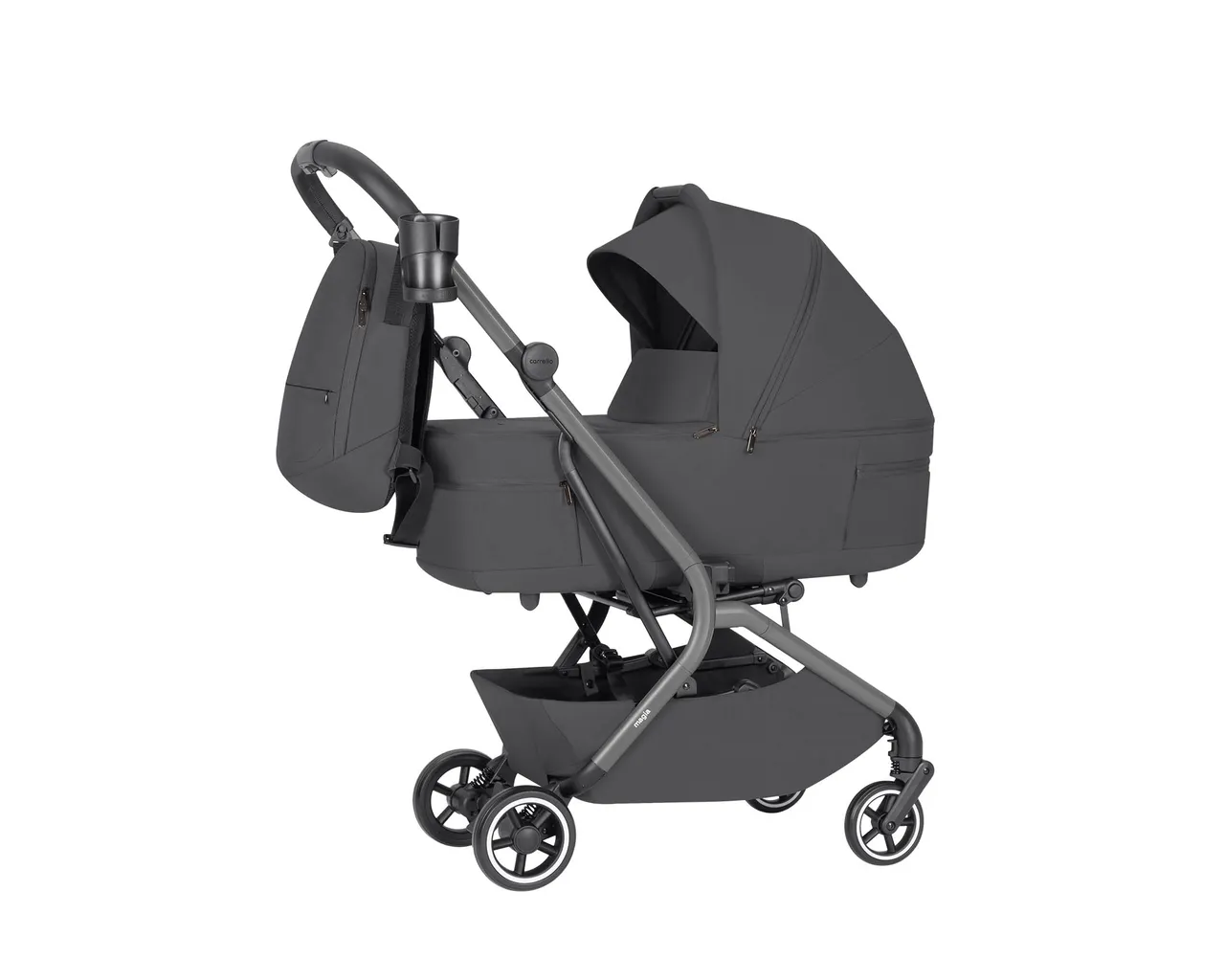 Carrello Magia to ultra-lekki wózek 2w1 (9,75 kg), który jako jeden z nielicznych składa się wraz z gondolą do wymiarów bagażu podręcznego. Łączy pełnowymiarowy komfort noworodka z mobilnością miejskiej spacerówki, oferując wytrzymałość aż do 22 kg i bogaty zestaw akcesoriów.