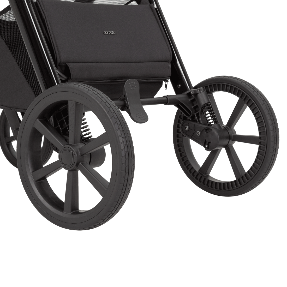 Omega Plus została wyposażona w najbardziej zaawansowany układ jezdny w rodzinie Carrello, co czyni ją idealnym wózkiem zarówno do miasta, jak i na leśne ścieżki.
