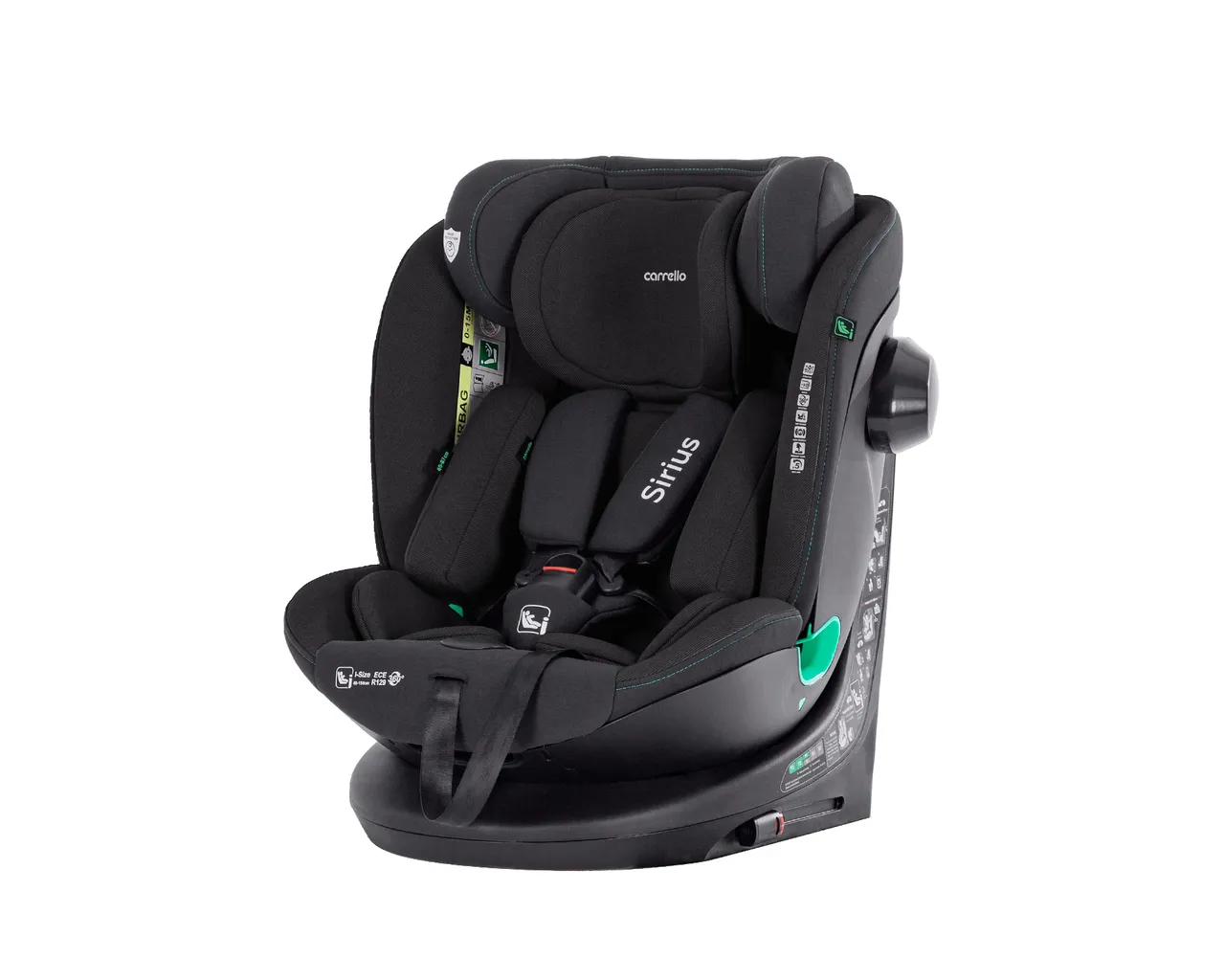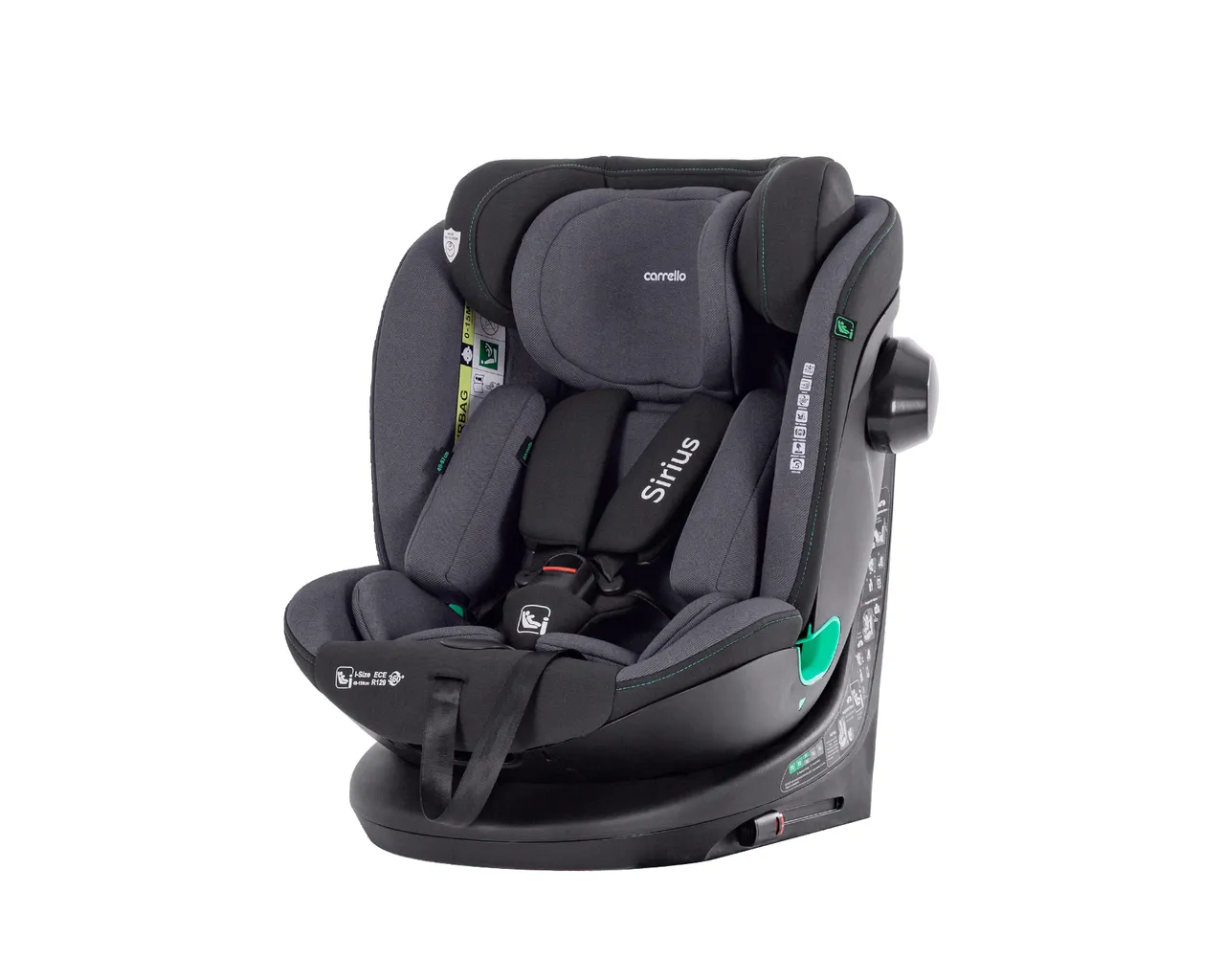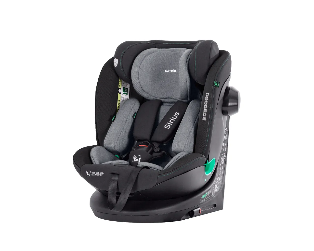 Carrello Sirius to innowacyjny fotelik i-Size (40-150 cm) z funkcją obrotu 360°, który dzięki systemowi ISOFIX oraz pasowi Top Tether gwarantuje najwyższą stabilność i bezpieczeństwo przez pełne 12 lat. Wyposażony w zaawansowaną ochronę boczną SPS oraz 10-pozycyjny regulowany zagłówek, zapewnia dziecku idealne dopasowanie i komfortową pozycję spoczynkową na każdym etapie rozwoju.