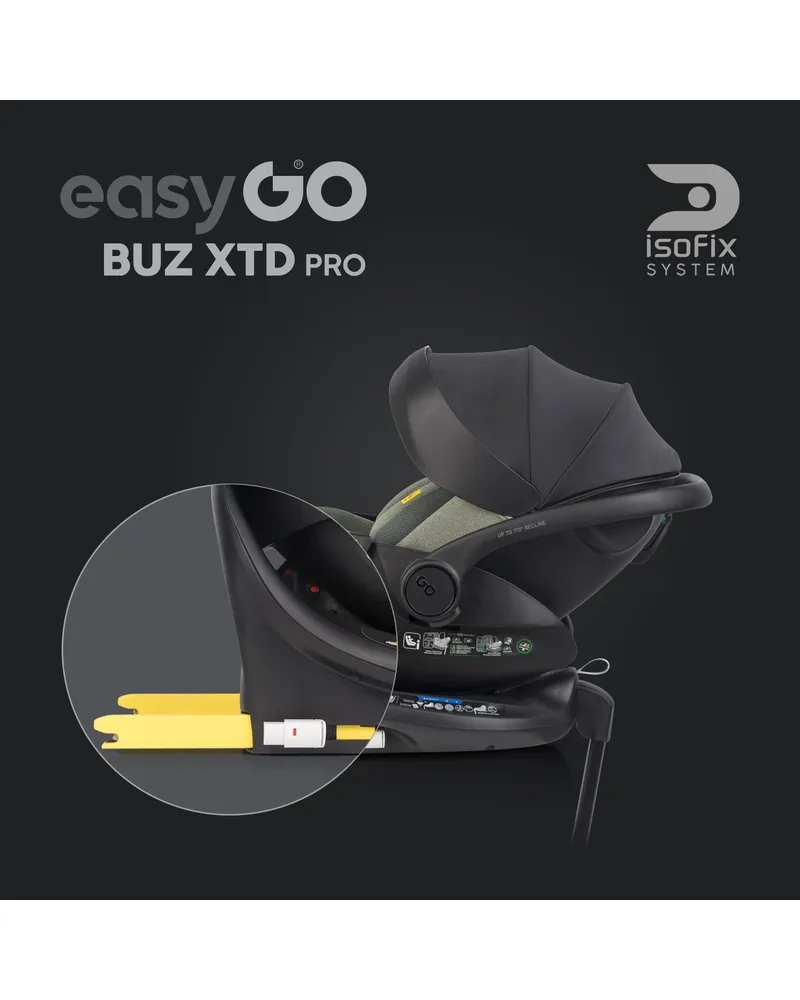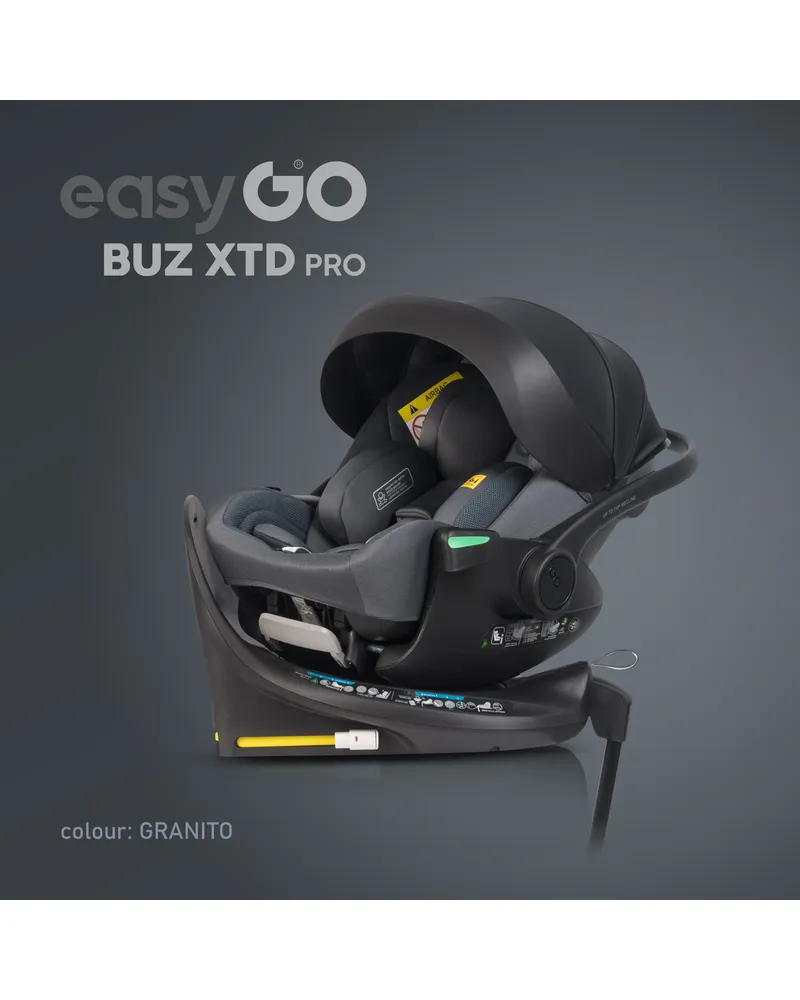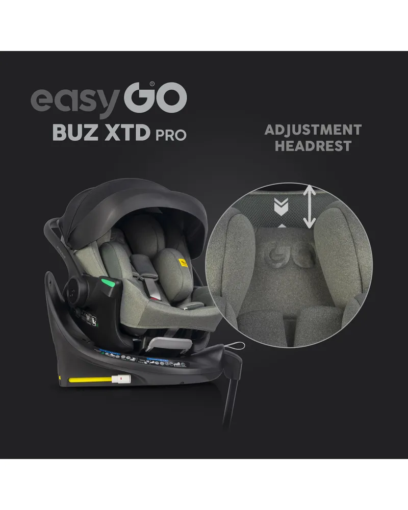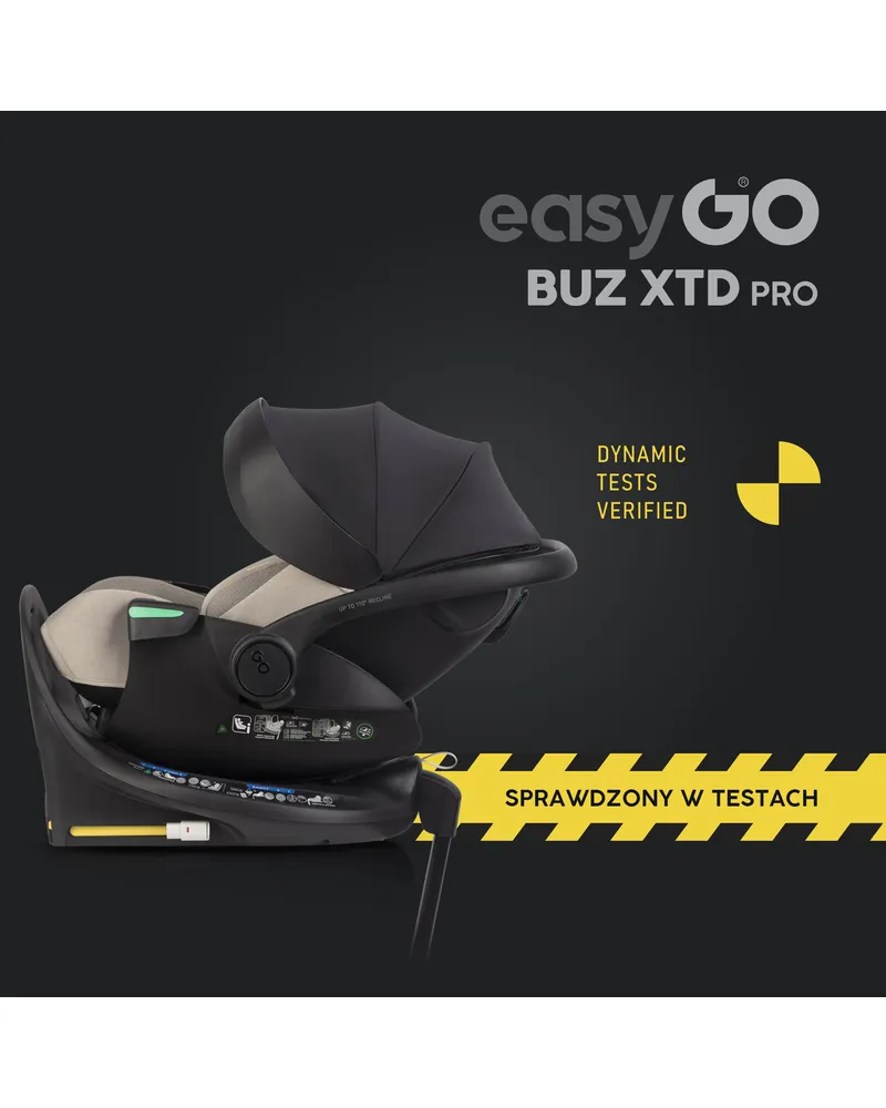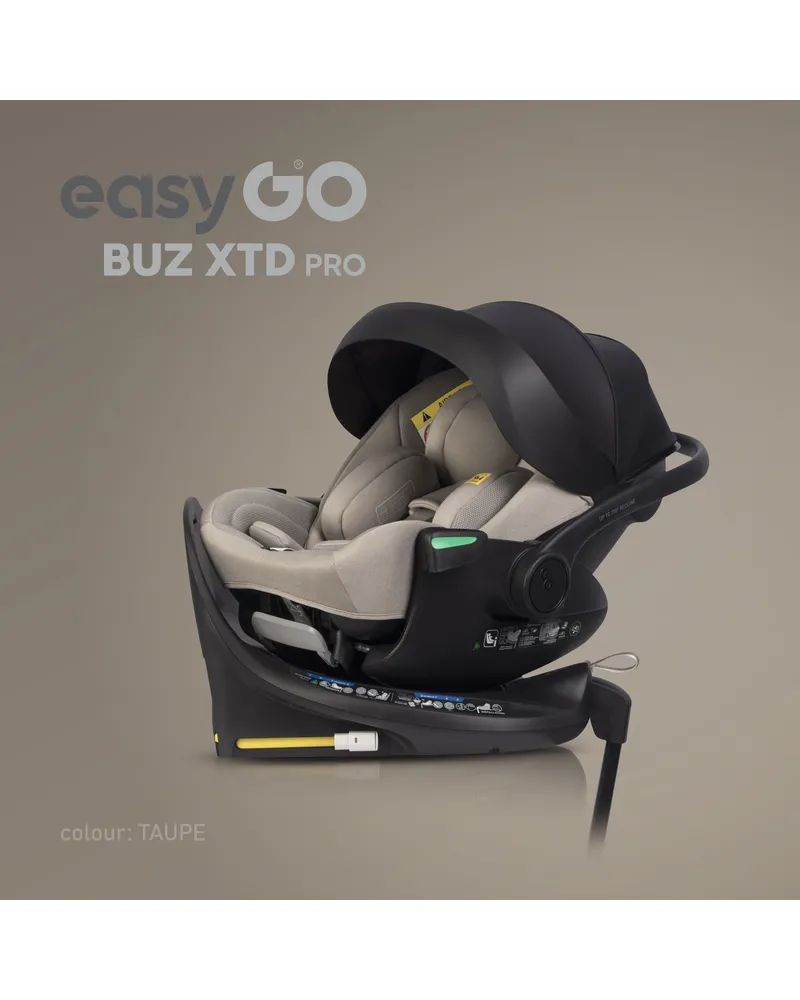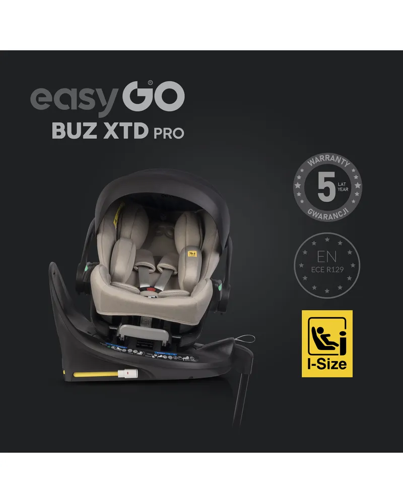 EasyGo BUZ XTD PRO to fotelik samochodowy dla dzieci 0-13 kg (40–87 cm) z funkcją rozkładania do spania i obrotową bazą ISOFIX, zapewniający maksymalny komfort i bezpieczeństwo w podróży. Można go zamontować na wózku dziecięcym, zastępując gondolę, a regulowany zagłówek automatycznie dopasowuje pasy do wzrostu dziecka. Dostępny w eleganckich kolorach Taupe, Ink, Granito i Greener.
