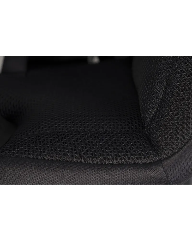 Tapicerka wykonana z oddychającej tkaniny 3D o strukturze plastra miodu skutecznie odprowadza wilgoć i zapobiega przegrzewaniu. Miękka dzianina na zewnątrz oraz wkładki z pianki memory foam dopasowują się do ciała dziecka, zapewniając stabilne i komfortowe podparcie nawet podczas długich podróży.