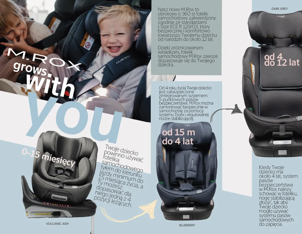 Mast M.Rox i-Size to obrotowy fotelik samochodowy 360° z systemem Isofix, przeznaczony dla dzieci od urodzenia aż do około 12 roku życia (40–150 cm). Zapewnia najwyższy poziom bezpieczeństwa zgodny z normą i-Size oraz komfort podróży w eleganckich kolorach Blueberry, Dark Grey i Volcanic Ash.