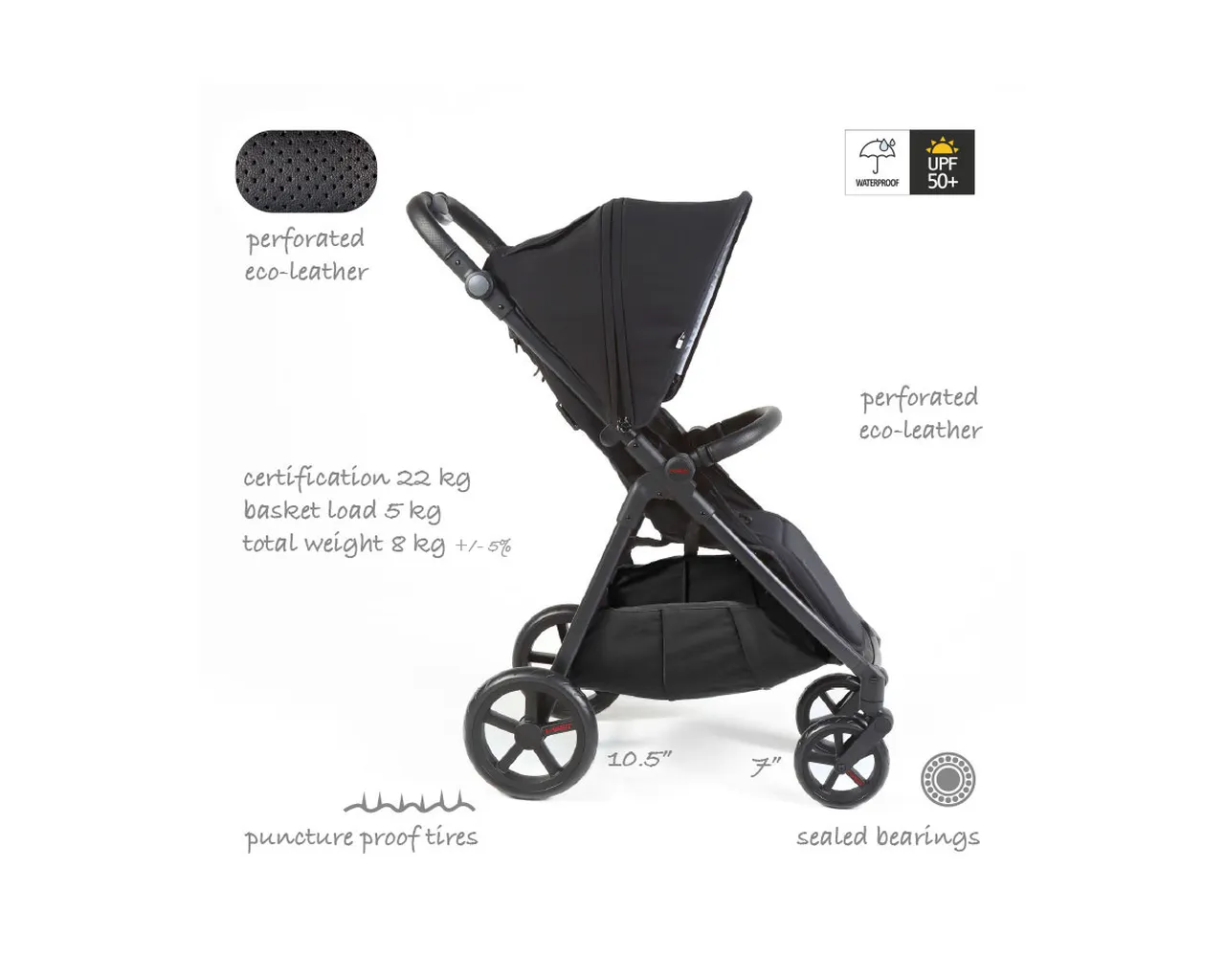 Elementy wykończeniowe z perforowanej skóry syntetycznej dodają elegancji i poprawiają komfort chwytu. Koła wykonane z trwałych kopolimerów EVA są odporne na przebicia i nie wymagają pompowania.