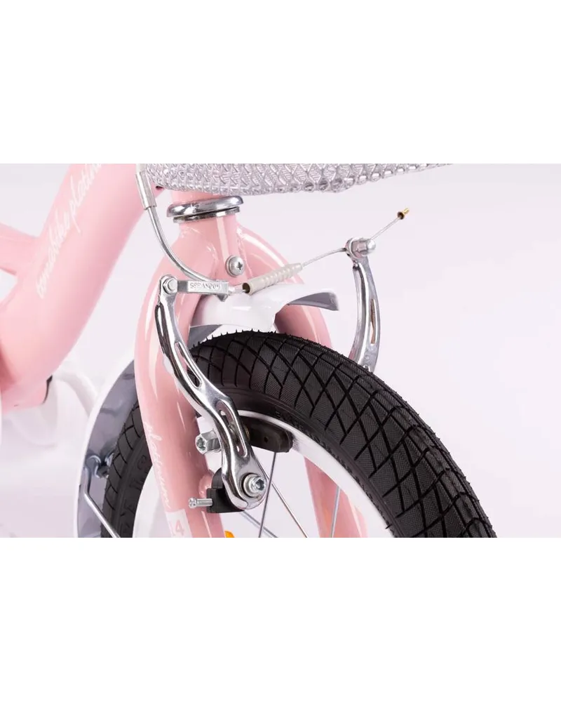 TOMABIKE™ PLATINUM 16” to stabilny rower dziecięcy z prowadnikiem, bocznymi kółkami i podwójnym systemem hamowania (V-brake + torpedo), idealny dla dzieci od 4 lat uczących się samodzielnej jazdy. Wzmocniona, obniżona rama, regulowane siodełko i kierownica oraz bogate wyposażenie (koszyk, błotniki, dzwonek, odblaski) zapewniają komfort, bezpieczeństwo i dopasowanie do rosnącego dziecka.